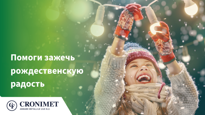 Уже четвёртый год подряд компания CRONIMET Nordic проводит рождественскую кампанию, выручка от которой направляется детям из приёмных и семейных домов. За каждую тонну металла, которую мы закупим в декабре, мы пожертвуем один евро детям, оставшимся без родительской опеки.